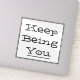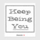 Display "Keep Being You" motivational phrase on any flat surface like binders and laptops. Black lettering and black border on white background.
