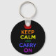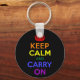 Keep Calm and Carry On vintage-style design in a rainbow of colours against a black background.