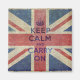 Vintage design: "Keep Calm and Carry On" with UK flag background.