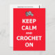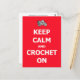 A postcard of "Keep calm and crochet on", on red and decorated with a black and white skein of wool and two red crochet hooks.