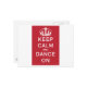 The "Keep Calm and Dance On" design in red has people partying on a dance floor in front of big speakers and disco ball in the shape of the crown of the classic "Keep Calm and Carry On" posters.