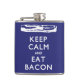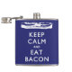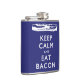 Keep Calm And Eat Bacon. Bacon will calm you, love you and keep you…. well, YOU! Devour delicious bacon and self-actualise. Based on the World War Two Poster, "KEEP CALM AND CARRY ON". White text and image over a navy blue background (#000080 Hex Colour).