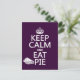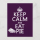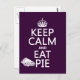 This reads Keep Calm and Eat Pie, in the style of the classic keep calm poster. There is a silhouette of a delicious full pie beside the words. This is a great fun design for everyone who loves pie, and uses it as an emergency measure. Wonderful gifts for bakers and cooks and pie lovers.