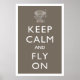 Fantasy dirigible encourages everyone to "Keep Calm and Fly On" in this fun twist on the popular British poster from World War 2. Originally in red and white, this version takes a more neutral turn in slate grey and white.