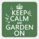 This reads Keep Calm and Garden On, in the style of the classic keep calm poster. Leaves are growing from the letters. It's a beautiful simple design which makes a beautiful range of products for the gardener in your life.