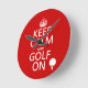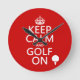 This is the classic Keep Calm poster reworded to 'Keep Calm and Golf On'. There is a silhouette of a golf ball on a tee next to the letters. It's a striking design, popular with everyone who loves golf. Available on a wide range of products, from towels to storage jars, to travel tags. It makes great gifts for golfers and golf fans.