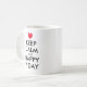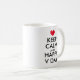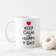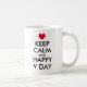 Keep calm and Happy Valentine's Day coffee mug. Cute cup with red heart. Keep calm and carry on meme with little heart. Valentines Day typography humour. Funny gift idea for boyfriend or girlfriend in love.