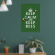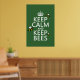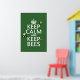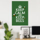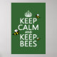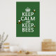 This reads Keep Calm and Keep Bees. Cartoon bees buzz alongside the words. It's a beautiful design, really popular with anyone interested in beekeeping and bee conservation.