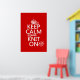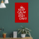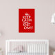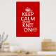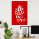 This reads Keep Calm and Knit On, in the style of the classic keep calm poster. There are balls of yarn and knitting needles nestling among the words. It's a beautiful design, which will please anyone who loves to knit. It makes a great range of presents for knitters, and home furnishings for crafting / sewing rooms.