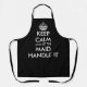 Keep calm and let the maid handle it housekeeping Apron. Funny black & white cleaning aprons with humourous quote. Personalise with your own keep calm and carry on quote. Black or custom colour. Great for home, office, kitchen, work, business, company, shop, service and more. Create cool aprons for coworkers, staff, personnel, employees, servers, colleagues, boss, volunteers, wife, girlfriend, mum, sister, aunt, grandma, professional cleaner, house keepers etc. Also great for baking, cooking and BBQ parties.