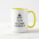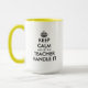 Keep calm and let the teacher handle it funny 15oz coffee Mug. Create your own funny Keep Calm and Carry On quote. Modern typography template with crown. Fun personalized cups for home, school or office. Add your own custom text. Cool Birthday or Christmas gift idea for kindergarten teacher, educator, coach, instructor, dean, principal, friends, family, coworker, colleague, staff, employees, corporate workers, personnel etc. Yellow colored handle and inside. Double sided print.