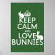 The design reads 'Keep Calm and Love Bunnies' in the style of the classic poster. There are two beautiful bunny silhouettes sitting on the words. It's a beautiful design, great for everyone who loves, keeps or breeds bunny rabbits.