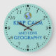 This design for earth lovers says Keep Calm and Love Geography. It has an image of a globe instead of the keep calm crown.