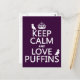 This reads 'Keep Calm and Love Puffins'. Two puffin silhouettes stand on the letters. It's an elegant, clean design, perfect for anyone who loves puffins.
