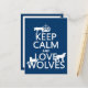 This reads Keep Calm and Love Wolves. Three wolf silhouettes lounge on the words. It's a beautiful design, perfect for anyone who loves wolves.