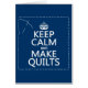 This reads Keep Calm and Make Quilts, in the style of the classic keep calm poster. It's just as good advice as the original in times of stress. There is a line of 'stitching' around the outside of the design, and a needle pierced in the corner. It's a beautiful design, which will thrill anyone who loves to quilt.