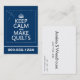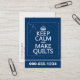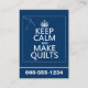 This reads Keep Calm and Make Quilts, in the style of the classic keep calm poster. It's just as good advice as the original in times of stress. There is a line of 'stitching' around the outside of the design, and a needle pierced in the corner. It's a beautiful design, which will thrill anyone who loves to quilt.