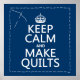 This reads Keep Calm and Make Quilts, in the style of the classic keep calm poster. It's just as good advice as the original in times of stress. There is a line of 'stitching' around the outside of the design, and a needle pierced in the corner. It's a beautiful design, which will thrill anyone who loves to quilt.