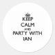 Use the search tool at my store to find other Ian merchandise. Keep Calm and Party with Ian products avaiable on tshirts,sweatshirts,kids shirts, infant onsies, stickers, magnets, and much more Ian clothing fully customisable to your specifcations. If you like what you see, please link to my store (www.zazzle.com/nameshirt) or email a friend.