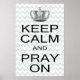 A play of words on the famous World War II poster, "Keep Calm and Stay Calm". The message "Keep Calm and Pray On" is an inspiring and timely message in troubled times. The Royal Crown give this message the vintage look of official royal decree. The light grey chevron backgrounds adds detail and modern touch to this timeless message.