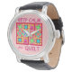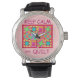 Show off your love of quilting with this fun and colourful quilt block wrist watch proclaiming "Keep Calm and Quilt" on a coral pink background. This design is original quilt art and favourite patchwork quilt blocks plus unique blocks including log cabin, pinwheel, star, and square in a square blocks. The word "quilt" is easy to change to another word of your choice. The quilt design is in vibrant and dynamic colours of orange, yellow, pink, turquoise, and lime green for a beautiful colour palette. Fully customisable to personalise. Quilt art is original art from fabric and quilt designer Phyllis Dobbs. This art is available on other products and in several colour backgrounds and is also available on more Keep Calm products with different quilt art. More products are available in Phyllis' BusinessWithFlair store.