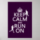 This design reads 'Keep Calm and Run On' in the style of the classic keep calm poster, including the crown at the top. There are silhouettes of two figures running over the letters. Great as gifts or treats for anyone who is in training or loves to run. Great presents for coaches and trainers.