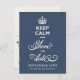 Ivory White Keep Calm Typography Text On A Dark Navy Blue Background, Curly And Elegant Script, Funny Save The Date Announcement Postcard.