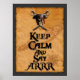 Parody of the popular keep calm and carry on quotation, but for Pirates! Keep Calm And Say ARRR. Pirate Skull and crossed swords with a vintage pirate map of the Florida Keys background.