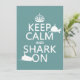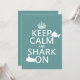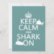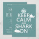 This reads 'Keep Calm and Shark On' in the style of the classic keep calm poster. Silhouettes of two sharks swim alongside the words. It's a great pleasing design, perfect for anyone who loves sharks.