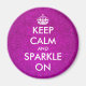 Keep calm and sparkle on pink glitter magnets. Round Keep calm magnet with faux purple shine background texture. KeepCalm and your text. Create your own funny parody. Shiny sparkly sparkles and glittery glimmers. Glam typography print for women and girls.