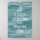 Funny motivational poster for swimming, diving or water sports fans with parody of the famous British slogan - Keep Calm And Swim On - over teal blue seawater ripples. You may remove the funny slogan and add your own text, resize or crop the image etc.