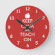 Keep Calm and teach on custom wall clock. Red Keep Calm wall clock with numbers and apple silhouette icon. Create your own funny keep calm and carry on parody. Funny Birthday gift idea for school teacher, tutor, educator, assistant, friend, coworker, colleague, etc. Cute wall decor for  kindergarten, grammar school, pre school, bedroom, kitchen, class room, school, hall etc.