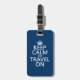 This reads Keep Calm and Travel On, in the style of the classic keep calm poster.  It's a popular design, and makes great gifts for anyone setting off on their travels, whether taking a gap year, or the trip of a lifetime.
