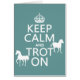 This reads Keep Calm and Trot On. There are two horses beside the letters. It's a clean beautiful design, popular with everyone who loves horses and riding.