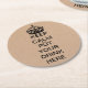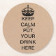 Stylish pulp board paper coasters done in a cardboard brown, with graphics of a black crown, on the top, and black text reading, KEEP CALM and PUT YOUR DRINK HERE. Great for parties, every day use and gift ideas.