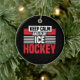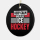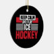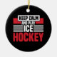 Hockey theme ornament with text of black, white, and red that reads Keep Calm And Play Ice Hockey!