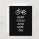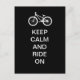 This fun design features a white bicycle silhouette on a black background and the text, "Keep Calm and Ride On".