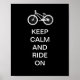 This fun design features a white bicycle silhouette on a black background and the text, "Keep Calm and Ride On".