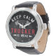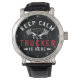 This bold wall clock humorously celebrates the arrival of the trucker. Against a black background with a striking red rim, it features a skeletal pair of hands gripping a steering wheel. The text "KEEP CALM THE TRUCKER IS HERE" is displayed in a mix of white and red lettering, accompanied by arrows, creating a fun and distinctive piece for any truck driver's home, garage, or workspace