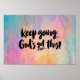 Modern Typography design with words in black calligraphy script, "Keep Going. God's Got This!" on colourful watercolor background.
