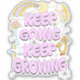 Retro style motivational "Keep going keep growing" text design with mushroom, flowers, stars, rainbow, clouds and sun decoration