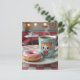 Say hi to a friend or family member with this sweet postcard featuring a strawberry doughnut and a cup of warm coffee at the diner. The coffee cup has a cute Kawaii cat. Cute pastel retro colours like pink and teal.