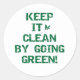 Green text environmental awareness t-shirts, buttons, reusable tote bags, mugs, cards, stickers, and more that read "Keep it clean by going green!". Help keep the earth clean and safe by promoting everyone to go green!