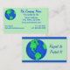 Keep the earth green business card for an environmental business or for personal to show your support with this eco friendly art design business card with the customisable words "Respect and Protect It". Use to promote and spread the word to recycle and to keep the earth beautiful and free from pollution. One side of the card has your contact information with a blue and green earth globe. The other side has a larger earth centred on a green background and accented with blue at the top and bottom. You can customise to add words in the green space or leave it blank. This business card is fully customisable. This design is original art by Phyllis Dobbs and is available on multiple coordinating products.