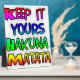 This artwork prominently features the phrase "KEEP IT YOURS HAKUNA MATATA" arranged in a stacked format. Each word is rendered in a distinct, vibrant colour with a bold black outline, creating an eye-catching and cheerful design.