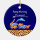 An ornament with a motivational quote which says: Keep Moving Forward. Designed with a digital watercolor image of a herd of wild animals running together. Animals include a jumping dolphin, a giraffe, elephant, kangaroo, rhino, lion and leopard. A white arrow underneath the text.