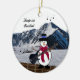 A perfect holiday ornament designed for a music teacher with a zest for fun or anyone who enjoys strumming their guitar. It features a snowman jamming on an electric guitar, set on a fretboard with a snowy mountain backdrop. Feel free to customize the message.