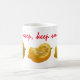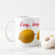 Yellow lemon which is eaten bite by bite and a red text Keep Smiling! Never give up and keep your chin up! If live gives you a lemon just make lemonade! Funny coffee mug. You can change or delete the images and the template text: Keep, keep, keep smiling!