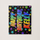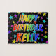 This vibrant, lively, birthday-themed jigsaw puzzle design features the message "HAPPY BIRTHDAY, KELLY" with the characters having a colourful rainbow spectrum inspired gradient pattern, in addition to a fun field of stars background pattern. A colourful puzzle like this might be a fun way to send birthday wishes to somebody named Kelly. [~Z0000468]