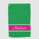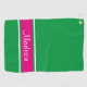 This design has a solid background colour of kelly green with pink and white stripes. The name is in a script font and can be customised using the template field.